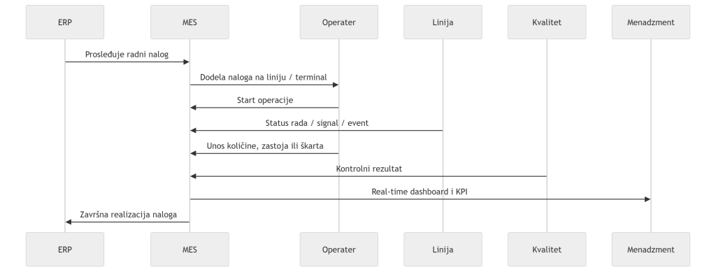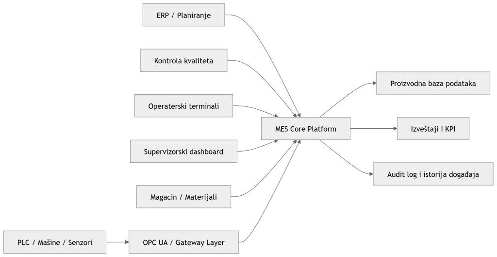 Ovakva arhitektura omogućava da MES bude centralna operativna tačka, dok se integracije sa ERP-om, kvalitetom i industrijskim uređajima rade kroz kontrolisane slojeve. ISA-95 upravo preporučuje jasno razdvajanje i povezivanje enterprise i manufacturing nivoa, što ovaj model prati.