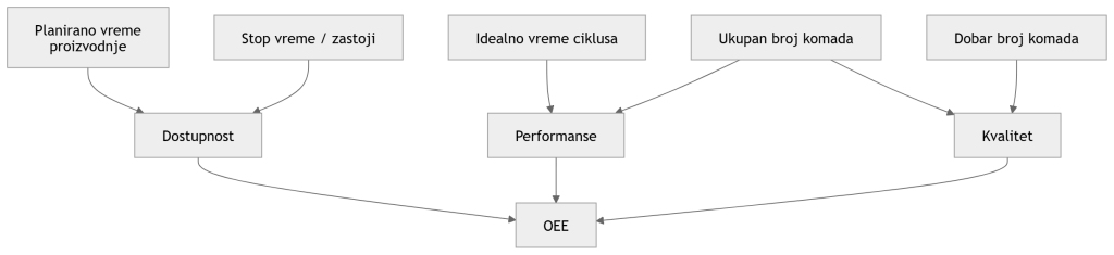 Ovakav prikaz omogućava menadžmentu da ne gleda samo ukupan rezultat, već da vidi da li je problem u raspoloživosti opreme, brzini rada ili kvalitetu proizvoda.