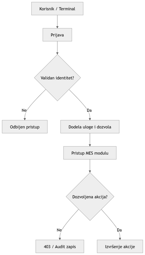 MES sistem upravlja osetljivim operativnim podacima, korisničkim pristupima i često komunicira i sa IT i sa OT okruženjem. Zato je bezbednost projektovana kao sastavni deo arhitekture.